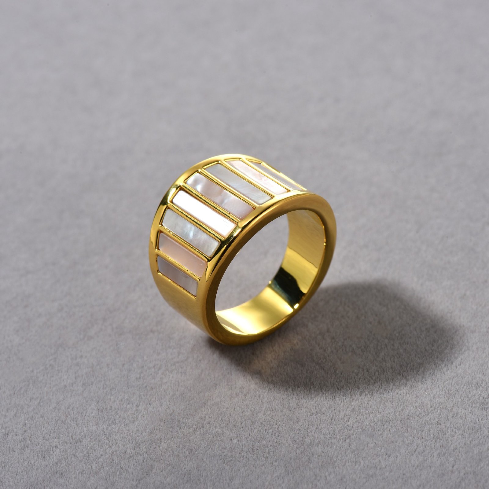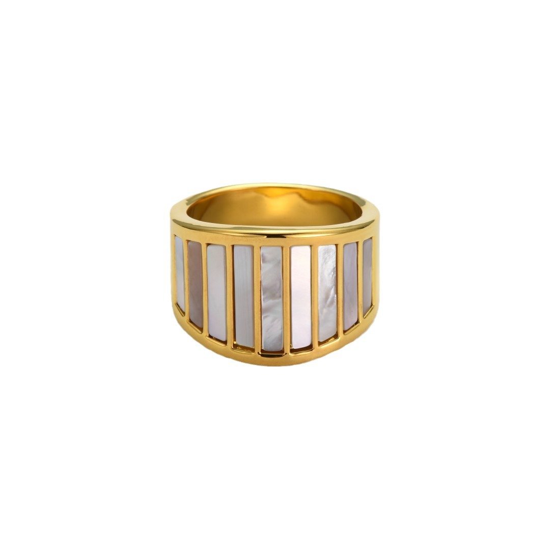 White Mother of Pearl Wide Ring – Unique Iridescent Glow, Brass Gold-Plated, Stackable Light Luxury Jewelry for Daily & Special Occasions